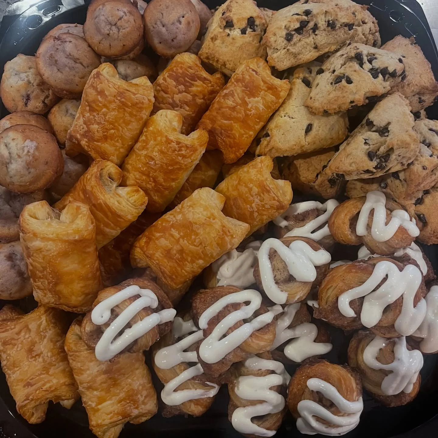 2 hard boiled eggs, bacon, assorted pastries, mini pancake skewers and fruit.
