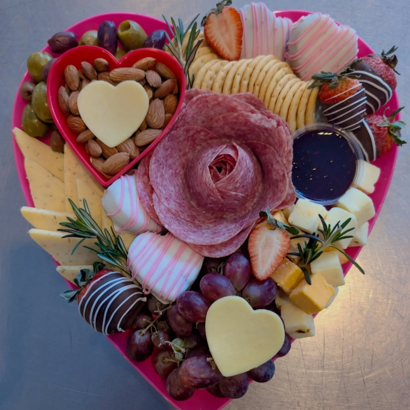Assorted cheese, salami, grapes, olives, crackers, almonds, oreo truffles and chocolate covered strawberries.